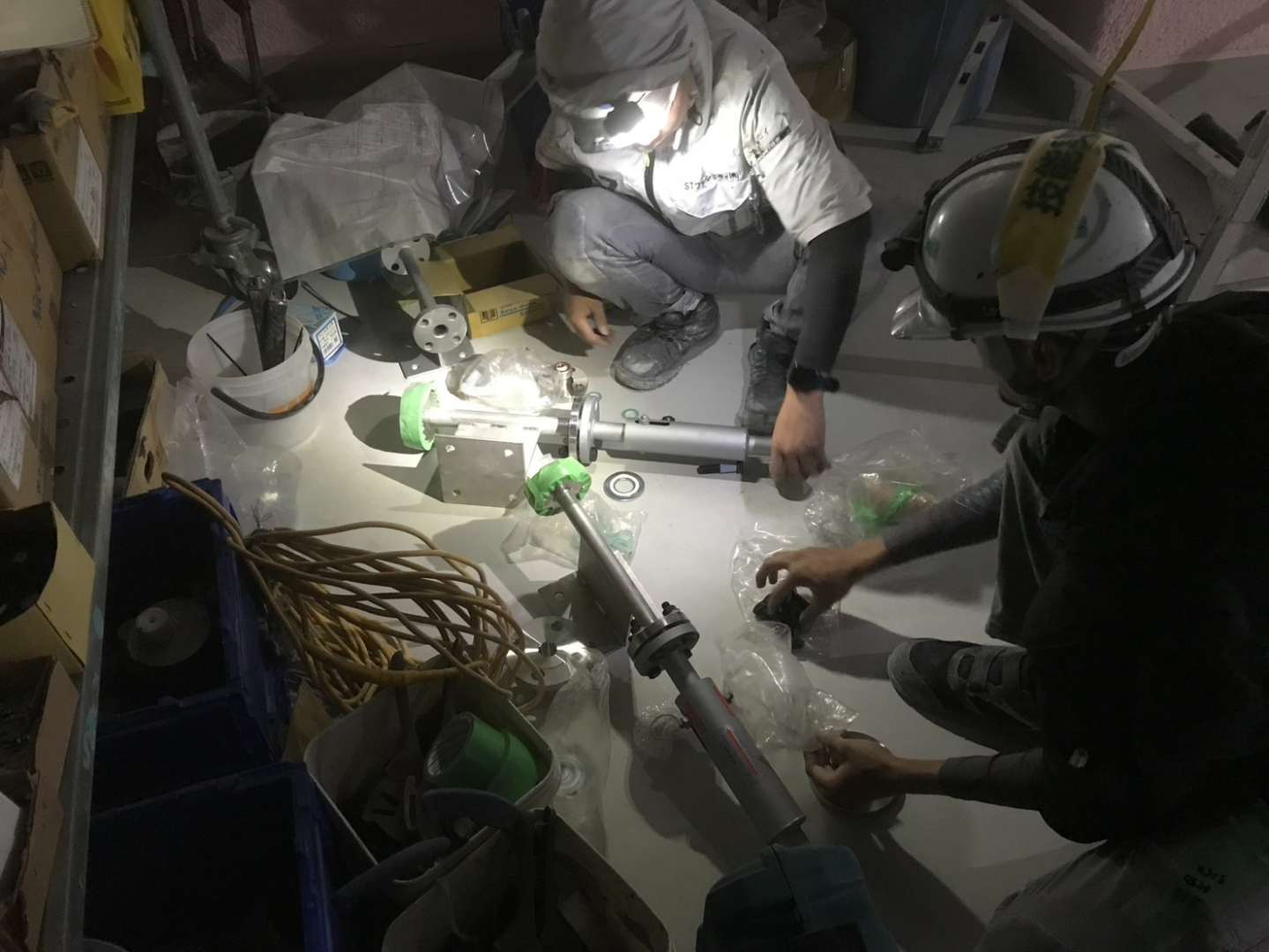 午前の作業を進めます。図面通りに正確に配管を接続する緻密な作業です。